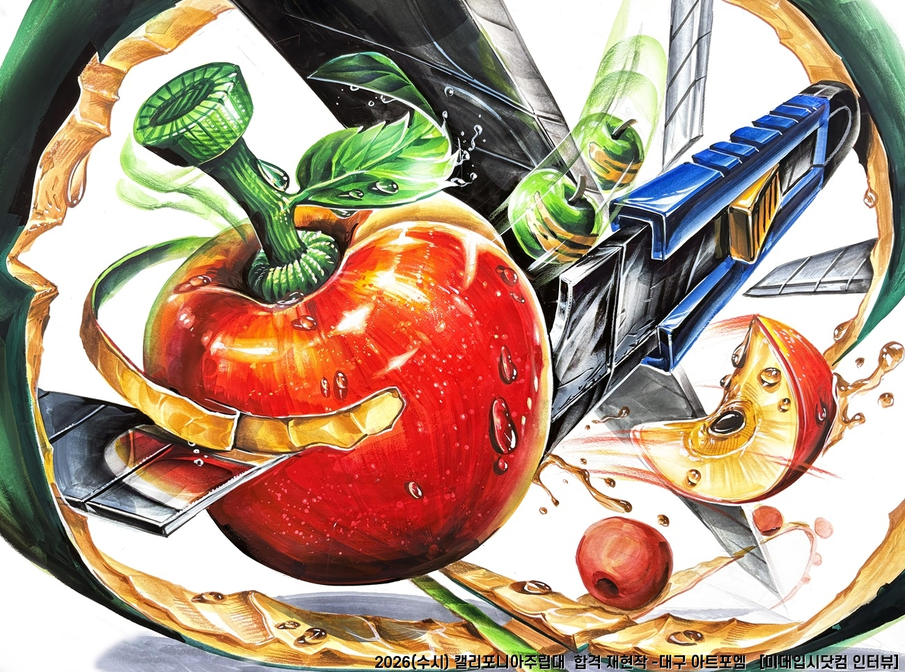 스케치를 빠르게 하고 완성도에 신경을 썼다 주제 크기를 크게 그리고 채도와 커터칼과 사과로 나타낼 수 있는 표현(깎인 사과나 칼로 썰어서 나온 사과 조각이나 사과 껍질 등)들을 적극적으로 써서 좋은 점수를 얻지 않았을까 생각한다 .