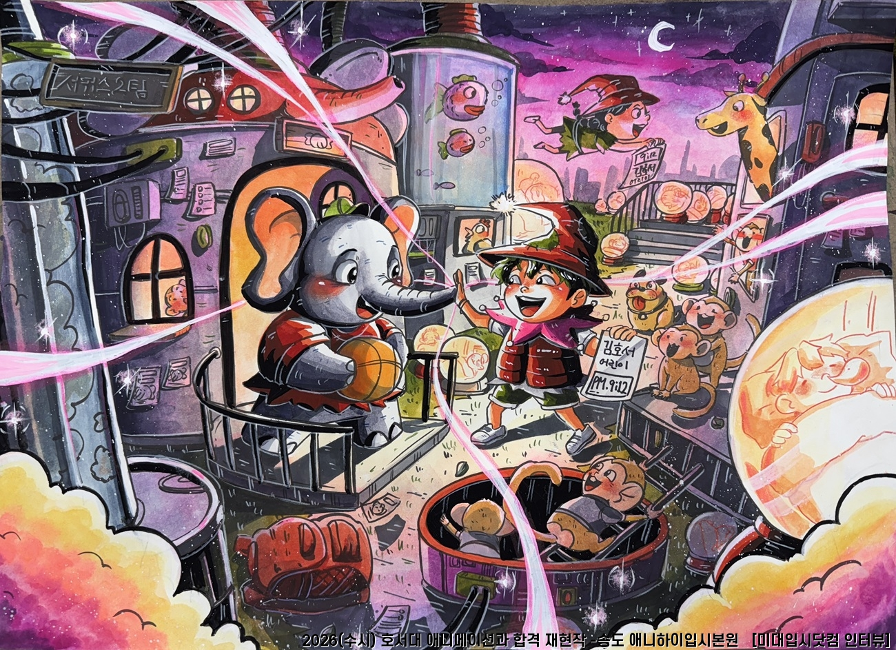 받은 주제는 꿈을 만드는 공장이었어서 꿈을 떠올리다가 꿈이라고 하면 동심이 핵심이지 않을까 싶었어요 그래서 아이들이 좋아할 만한 동물들이 많이 나오는 서커스단을 그려야겠다는 생각이 들었고 서커스 단원인 코끼리와 꿈의 요정이 하이파이브하는 장면을 상상하며 그렸어요 주제부는 잘 보이게 하기 위해 중앙에 배치했고 동선과 슈퍼블랙을 써서 강조했어요.