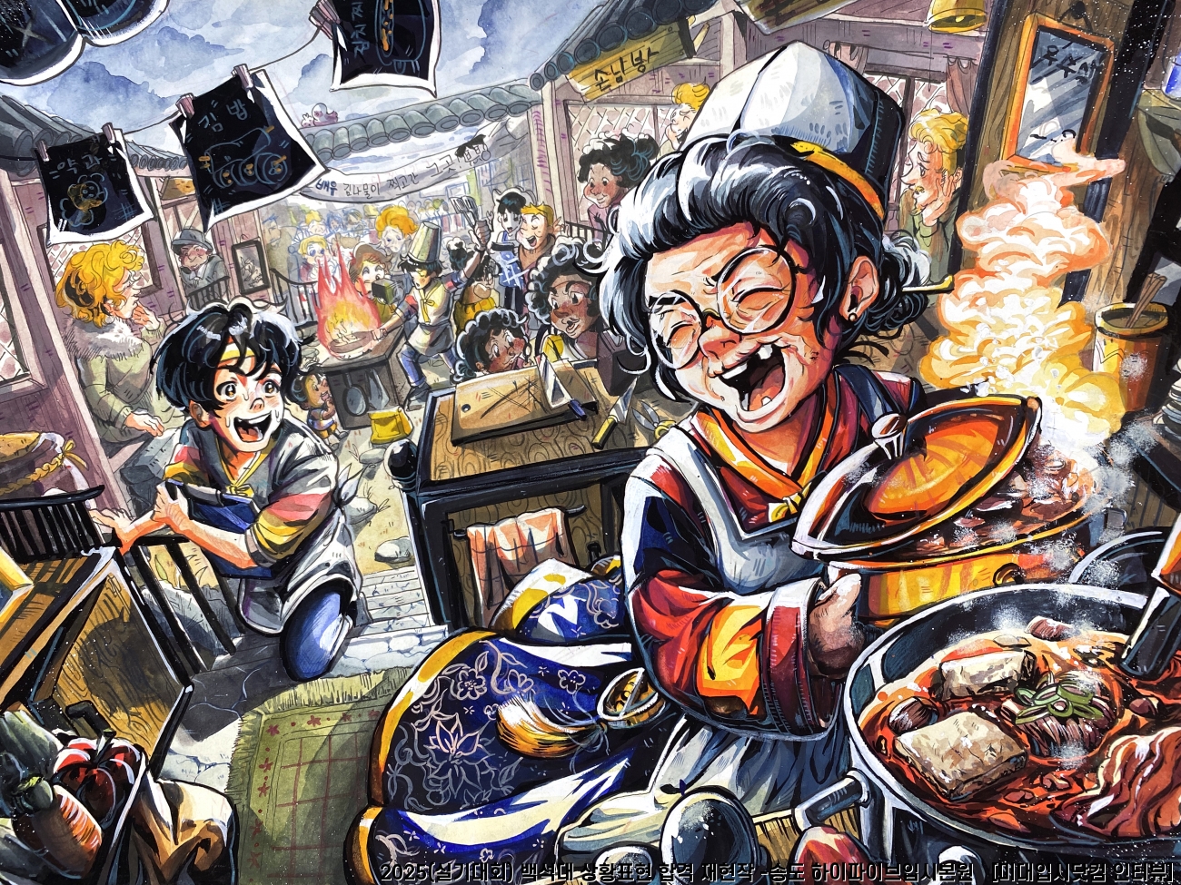 Q. 주제가 무엇이 였으며, 어떻게 풀어갔나요? 그림에 대한 설명을 해주세요 주제: 유명한 영화에 나온 한식을 먹어보기 위해 한식당 앞에 줄을 선 외국인들 풀이 : 주제부와 부주제부를 한식당을 운영하시는 직원분들로 구성하여 한식당이라는 주제와 알맞게 전통가옥이나 한복을 입혔고 그 안에서도 상황이 계속해서 이어지게 안에서 음식을 먹고 있는 사람이나 불쇼를 구경하는 사람들로 채우며 유명한 영화의 주인공이 다녀간 느낌을 내기 위해 간판이나 포스터같은 걸로 꾸몄습니다.